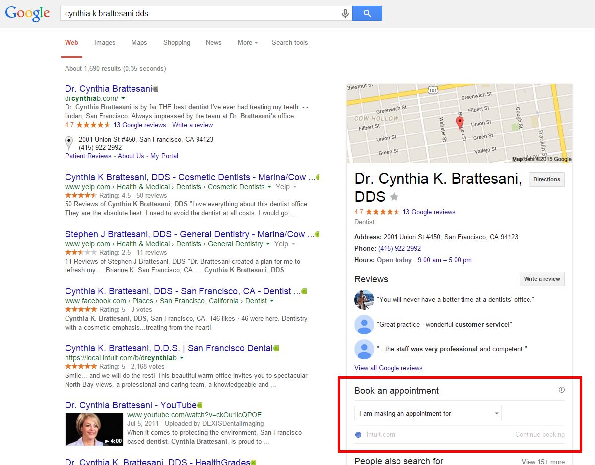 On the right side you can see what is boxed in red which is where you can make an appointment right through your Google search! It’s that simple! They don’t even have to call into your office! They can fill out this form through intuit’s software Demandforce and it is submitted to your Google Calendar if that is what your office uses.